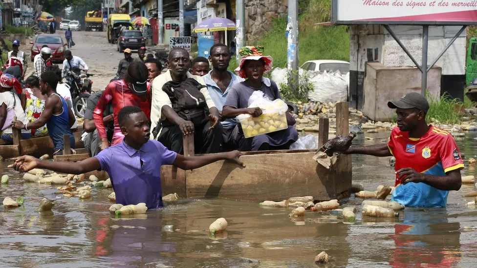 Les inondations ont semé le chaos à Kinshasa – la capitale de la République démocratique du Congo – avec de l’eau inondant les maisons et des habitants naviguant sur des routes submergées en canoë.
