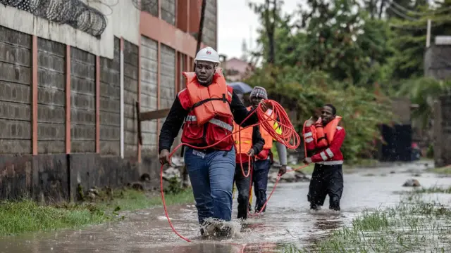 Getty Images Un pompier kenyan donne des instructions des gens lorsqu’ils traversent une route fortement touchée par les inondations après des pluies torrentielles à Kitengela, Kenya.getty Images