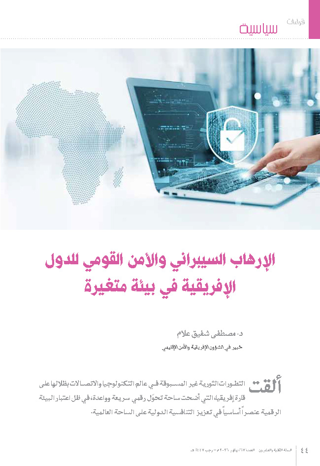 The study examined the impacts of cyberterrorism on national security in the African continent by analyzing the dimensions of the relationship between national security and cybersecurity, monitoring cybersecurity indicators according to the International Telecommunication Union (ITU), and assessing the risks of cyberterrorism in Africa. It then reviewed strategies for combating cyberterrorism on the continent before turning to an exploration of the future of African national security in light of the increasing cyberterrorism threats facing Africa. The study revealed that African countries suffer from weak cyber legal frameworks, fragile technical measures despite development efforts, the absence of effective regulatory mechanisms, weak cyber capacity building, and limited cyber cooperation both within and beyond the continent. Africa faces numerous risks in this context, most notably the rising rates of cybercrime, cyberterrorist targeting of critical infrastructure, terrorists’ exploitation of cyberspace for recruitment and propaganda, the use of cyberspace as a means of financing, and the growing reliance on alternative communication networks and remote-control technologies to evade government surveillance. Awareness of the dangers of cyberterrorism has increased across Africa, prompting states to improve legal frameworks and strengthen external cooperation to combat cyberterrorism, adopt approaches aimed at enhancing societal and institutional awareness of this form of terrorism, and employ artificial intelligence to counter cyberterrorism in Africa. In this context, the importance of the African Union and regional groupings—such as the Southern African Development Community (SADC), the Economic Community of West African States (ECOWAS), and the East African Community (EAC)—is evident in building regional cybersecurity strategies, facilitating data exchange, and leading joint action. These efforts help mitigate cyberterrorism risks facing vulnerable states on the continent, enhance Africa’s community-based security capabilities, and integrate African countries into a unified and comprehensive preventive defense line to confront cybersecurity threats at all levels.