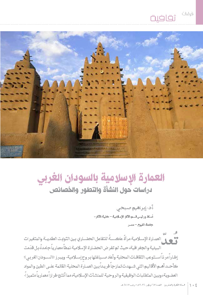 Islamic architecture is a mirror reflecting the cultural interaction between doctrinal constants and environmental and geographical variables. Islamic civilization did not impose a rigid architectural style, but rather presented a flexible framework that absorbed local cultures and reformulated them with an Islamic spirit. West Africa stands out as one of the most important regions that witnessed a unique fusion between local architecture based on mud and organic materials, and the functional and spiritual requirements of Islamic structures, resulting in a distinctive architectural style. Despite the visual and technical richness of this style, studies that address the geometric and structural analysis of this architecture still need further development and expansion. This study aims to shed light on the architectural components in the West Africa region, specifically in the cities of Timbuktu and Djenné in the Republic of Mali. This research provides an overview of Islamic architecture in Western Sudan, from the early days of Islam›s arrival there until the mid-20th century, and how the characteristics of the ancient and medieval periods of local history in these regions were reflected in the architecture. The article addresses the topic through the following analytical axes: Axis One: General features and characteristics of Islamic architecture in Western Sudan. Axis Two: Architectural origins of the Islamic architectural style in the Western Sudan region. Axis Three: Architectural examples (the Great Mosque of Djenné).